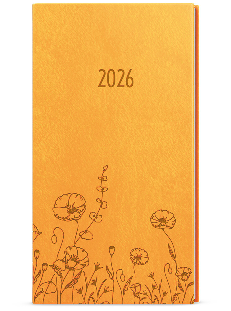 Kapesní týdenní diář v okrové barvě je vyráběný z jemné hladké vivelly s efektní ražbou s motivem Květin. Trendy a praktický doplněk do každé kapsy. Diář má velký prostor pro poznámky a plánování.