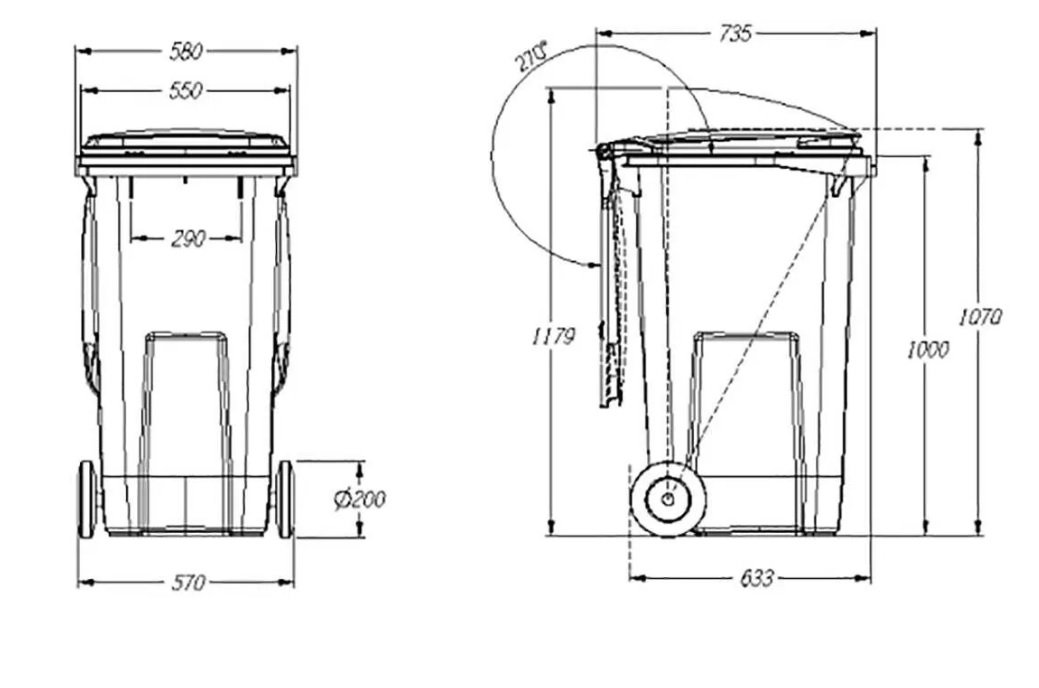 Nádoba na odpadky je vyrobená je z mrazuvzdorného a pevného polyetylenu technologií vstřiku, je velmi odolná proti vodě i UV záření. Opatřená je víkem pro uzavření a dvěma koly usnadňujícími manipulaci.