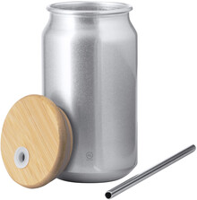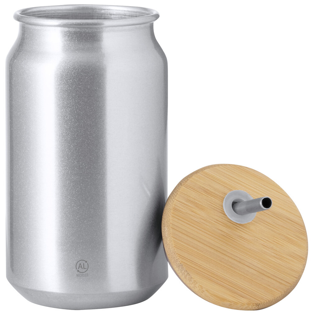 Pohár z recyklovaného hliníku s bambusovým víčkem a nerezovým brčkem na pití, 430 ml. V kraftové papírové krabici.