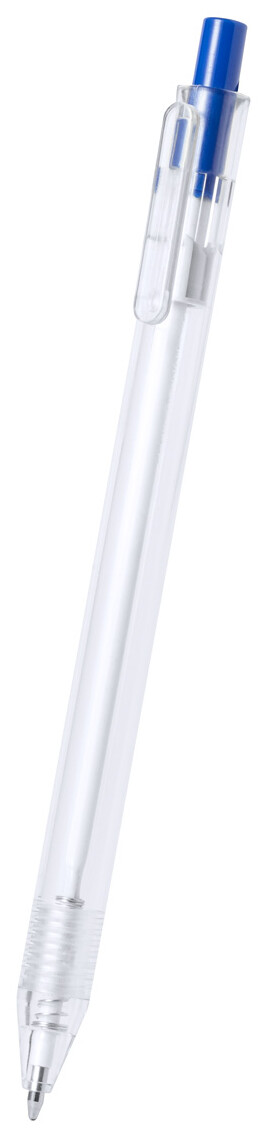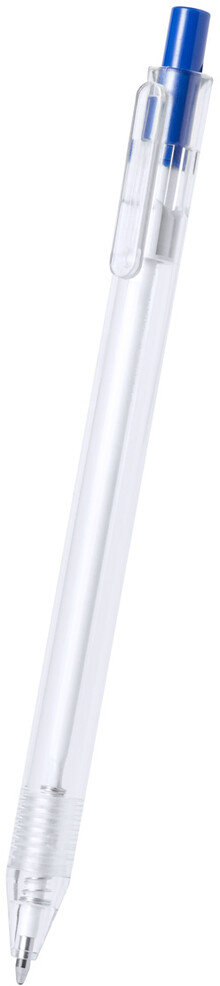 Průhledné plastové kuličkové pero RPET s barevným tlačítkem. S modrou náplní.