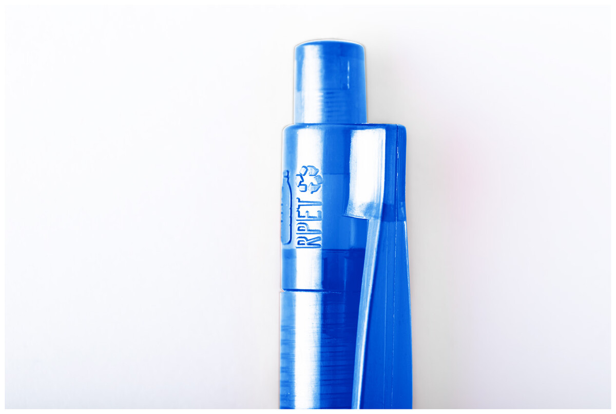 Průhledné plastové kuličkové pero RPET. S modrou náplní.