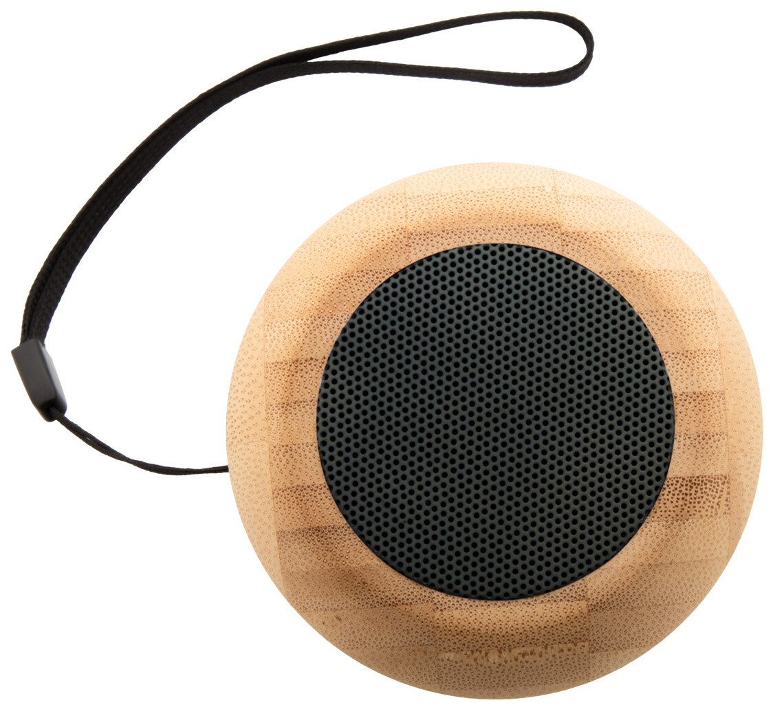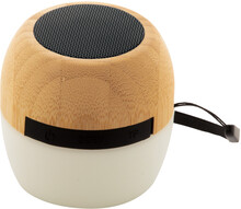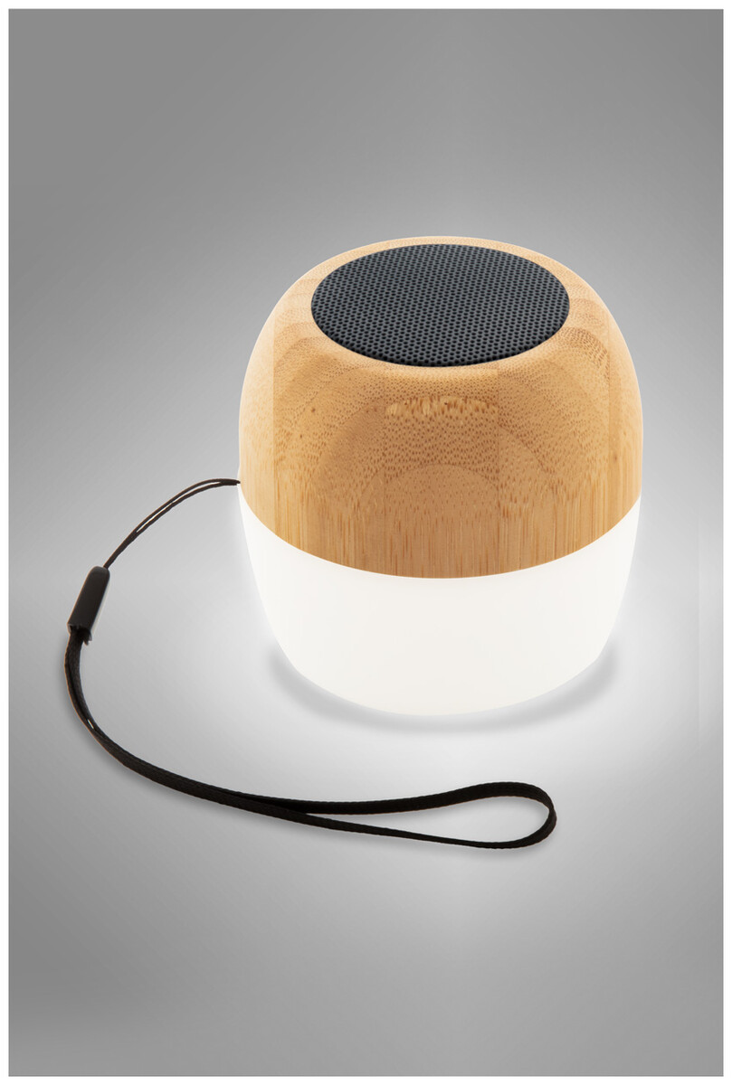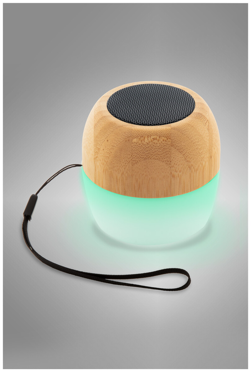 Bezdrátový reproduktor z recyklovaného ABS plastu a bambusového pouzdra s vícebarevným LED světlem ve spodní části. S popruhem na přenášení a vestavěnou dobíjecí baterií. Včetně nabíjecího kabelu USB.
