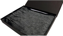 Elegantní, RPET polyesterová šála. V černé dárkové krabičce. S výrazným štítkem RPET.