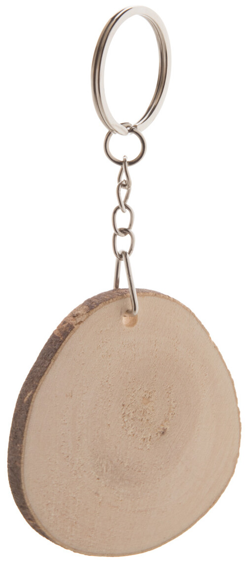 Přívěšek na klíče z přírodního dřeva s kůrou a kovovým kroužkem. Rozměry produktů se mohou mezi sebou lišit.