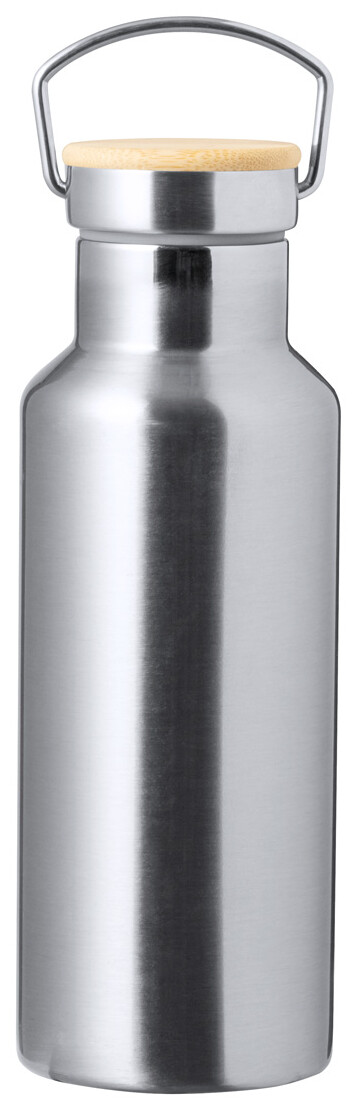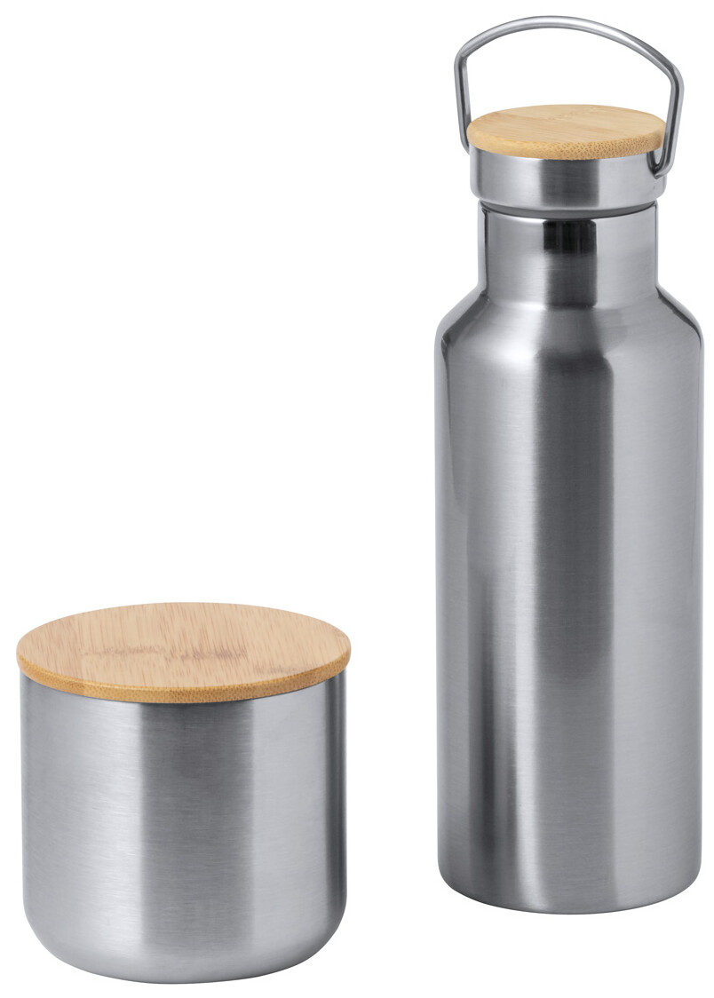 Dvoustěnná termoska z nerezové oceli. Včetně izolované láhve (500 ml) s bambusovým víkem a izolovaným kelímkem (300 ml). V kraftové papírové krabici.