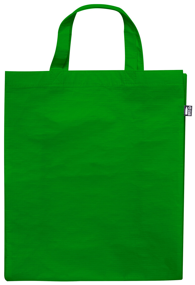 Nákupní taška z polaminovaného polyesteru RPET s klínem a krátkými uchy, 110 g/m2. S výrazným štítkem RPET.