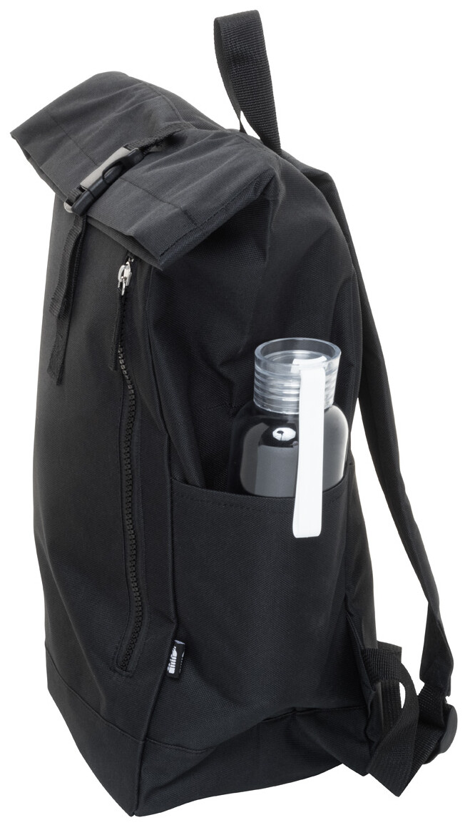 Rolovací batoh RPET se zapínáním na přezku, přihrádkou na notebook (14") a přední kapsou na zip. S polstrovanými zády a ramenními popruhy. Polyester 600D RPET s výrazným štítkem RPET.