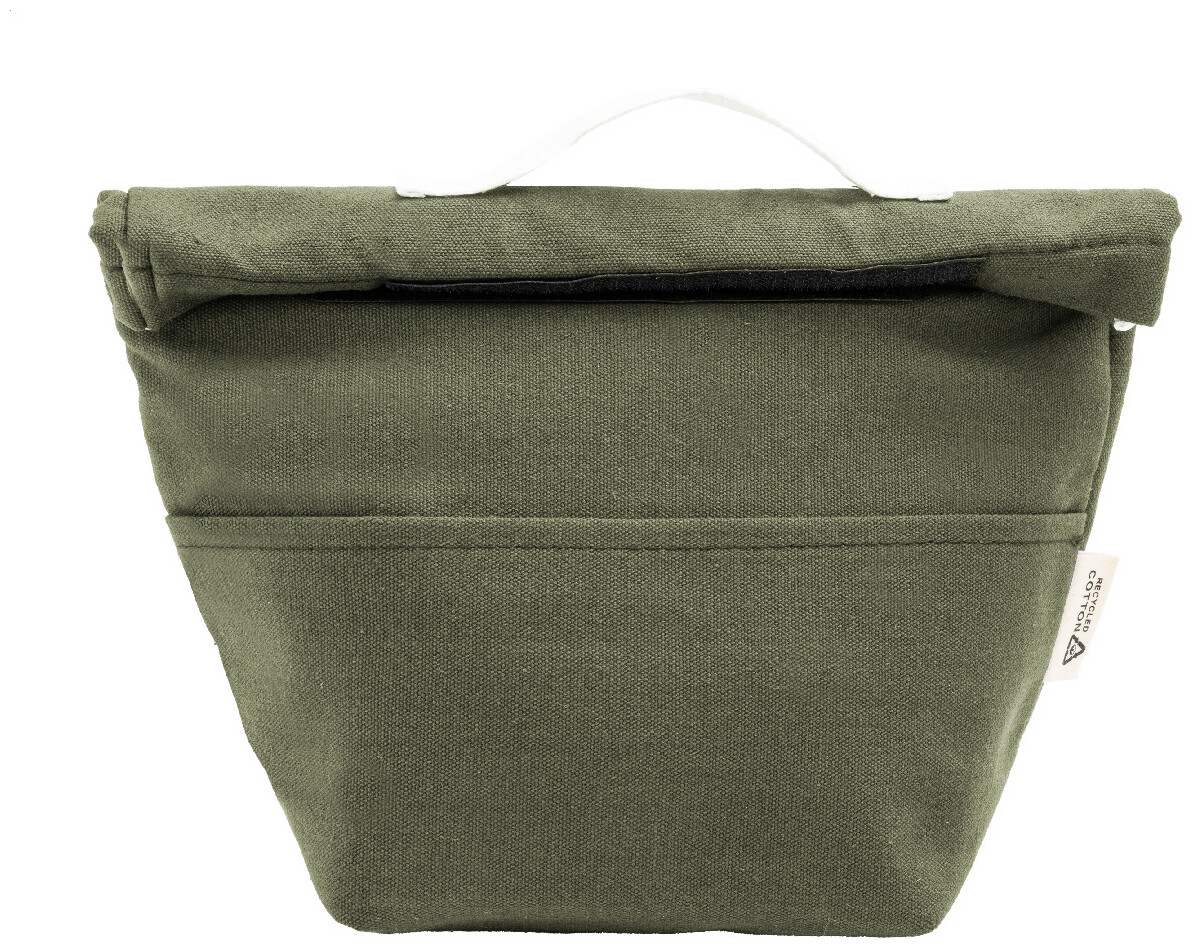 Chladicí taška z recyklovaného plátna s rolovacím vrškem, přední kapsou, hliníkovou výplní a zapínáním na suchý zip. 70 % recyklované bavlny a 30 % RPET polyesteru. S výrazným štítkem recyklované bavlny.