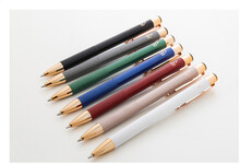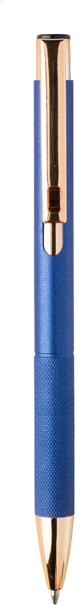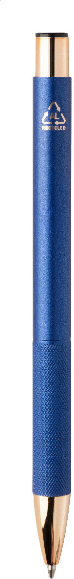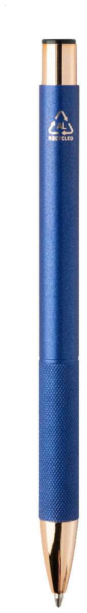 Kuličkové pero z recyklovaného hliníku s matným tělem, texturovaným úchopem a detaily růžového zlata. Se speciálním povrchem pro zrcadlové laserové gravírování v barvě růžového zlata. S modrou náplní.