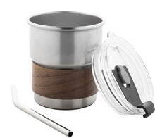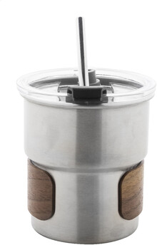 Jednostěnný cestovní hrnek z recyklované nerezové oceli s úchopem z ořechového dřeva, plastovým víčkem a brčkem z recyklované nerezové oceli. 260 ml.