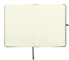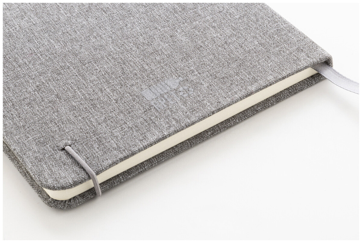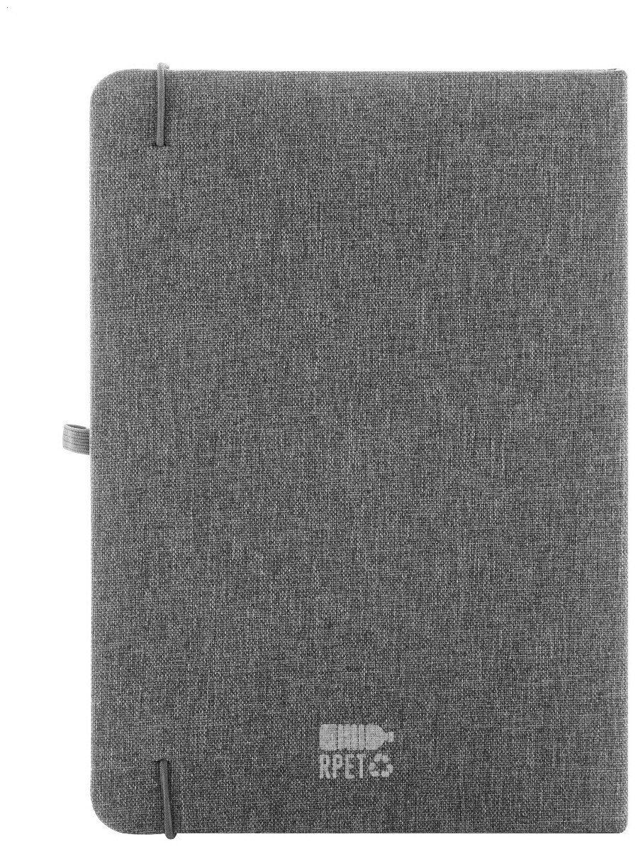 Blok A5 potažený polyesterem 300D RPET s 80 čistými listy. S gumovým páskem, záložkou a držákem na pero.