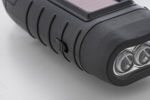 Baterka z recyklovaného ABS plastu se 3 LED diodami, vestavěnými solárními a dynamovými nabíječkami a karabinou.