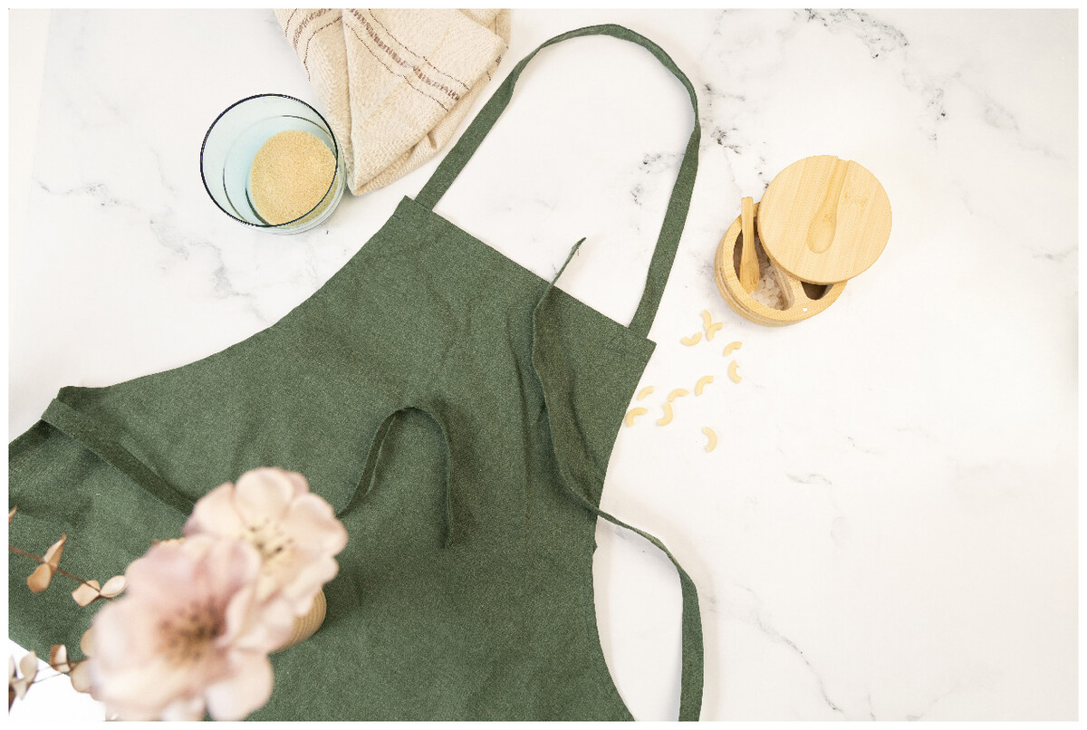 Kuchyňská zástěra ze 70% recyklované bavlny a 30% RPET polyesteru, 180 g/m2.