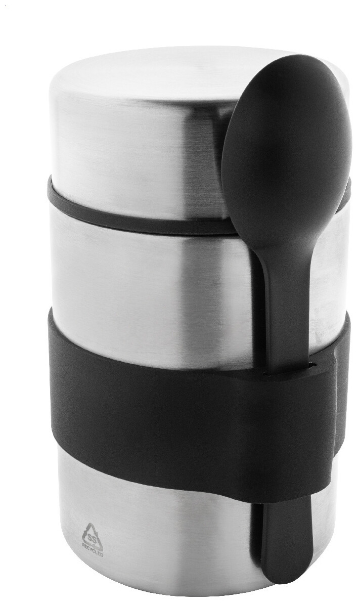 Dvoustěnná, vakuově izolovaná nádoba na jídlo z recyklované nerezové oceli se silikonovým úchopem a PP lžičkou. 450 ml.