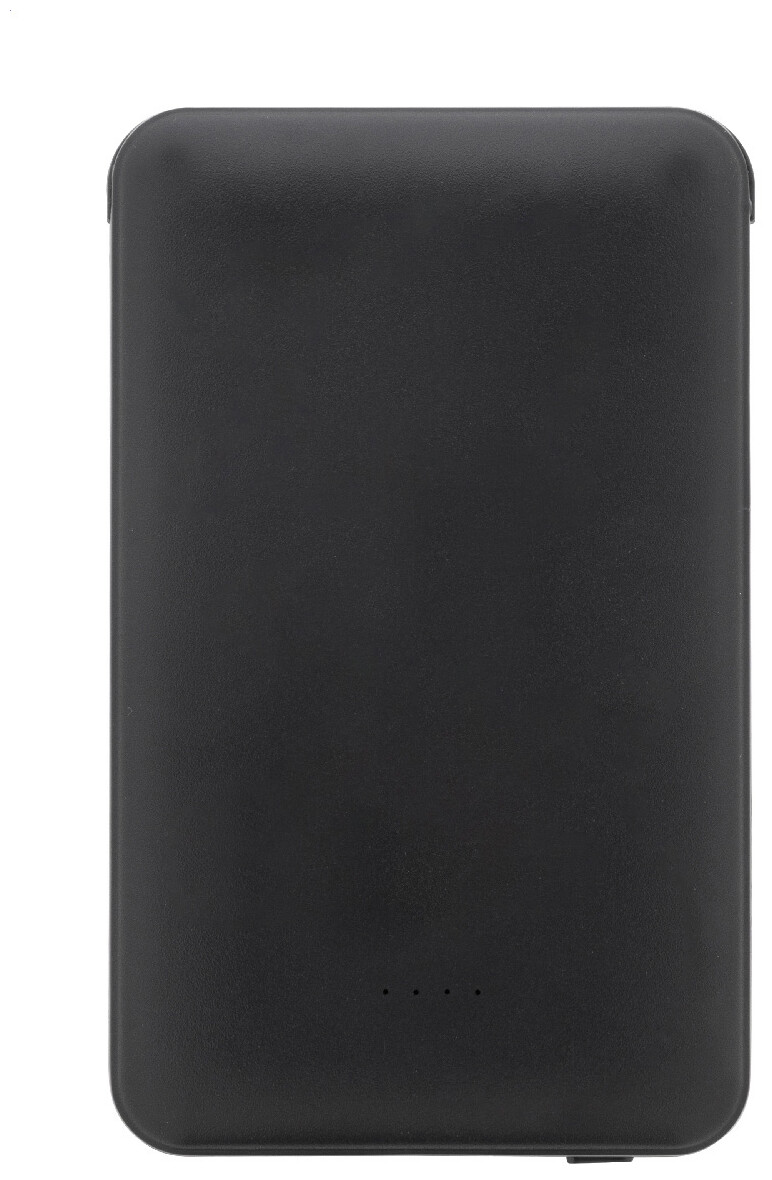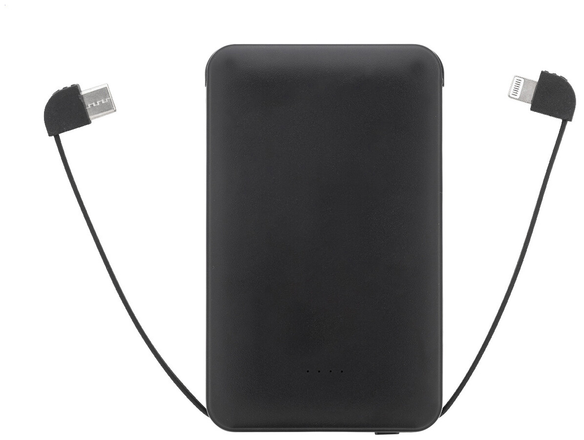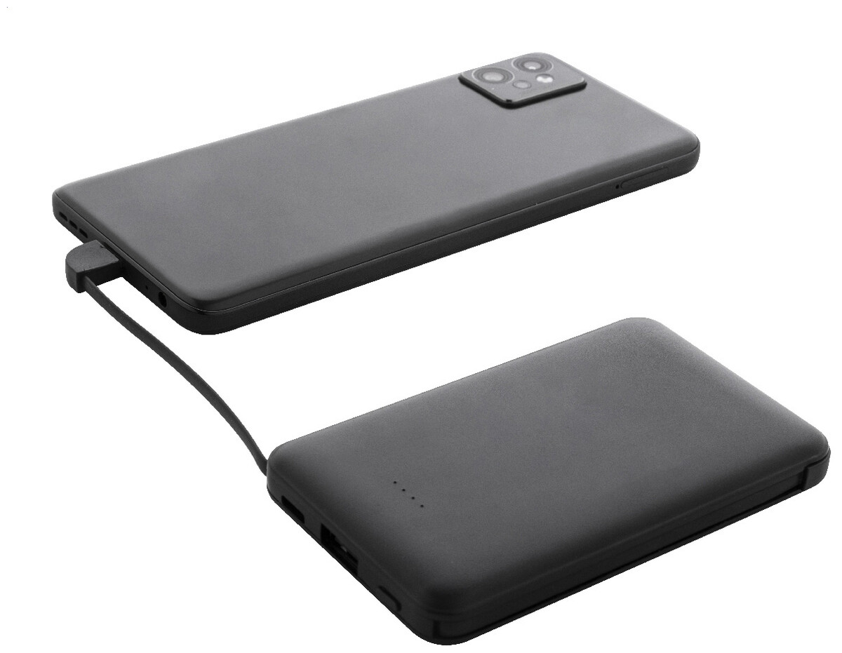 Power banka z recyklovaného ABS plastu s baterií 5 000 mAh a integrovanými nabíjecími kabely s konektory micro USB, USB-C a Lightning. S nabíjecím portem USB a vstupním portem USB-C. Včetně nabíjecího kabelu USB.