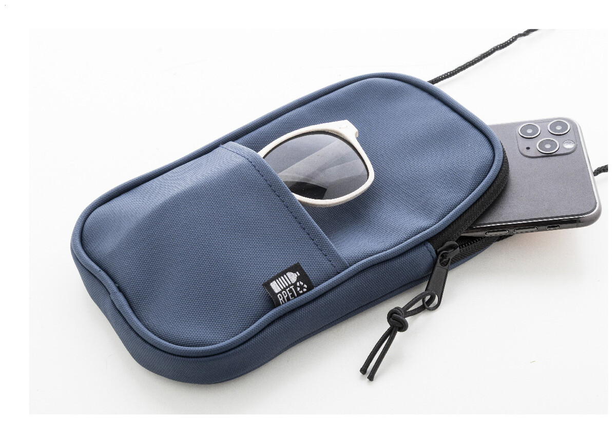 Voděodolná RPET crossbody taška na mobilní telefon s hlavní přihrádkou na zip, přední kapsou a nastavitelnou šňůrkou. Polyester RPET 600D potažený PU, s výrazným štítkem RPET.