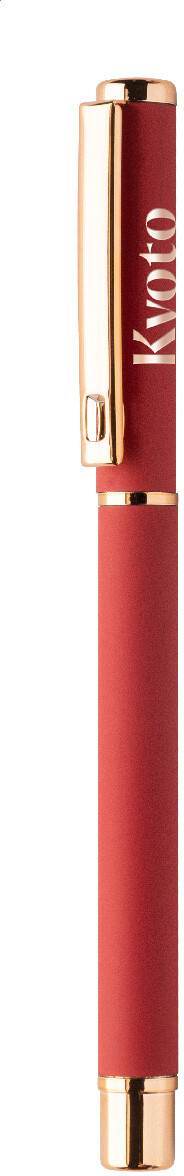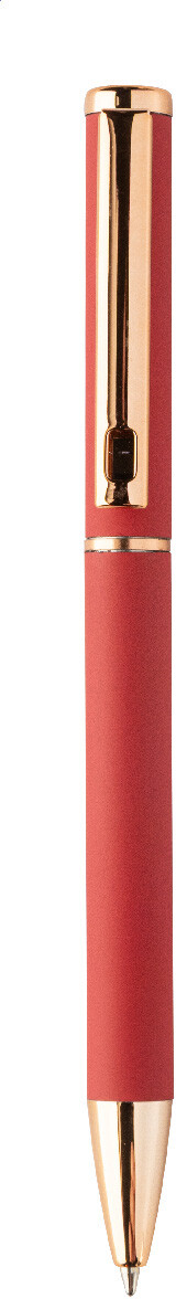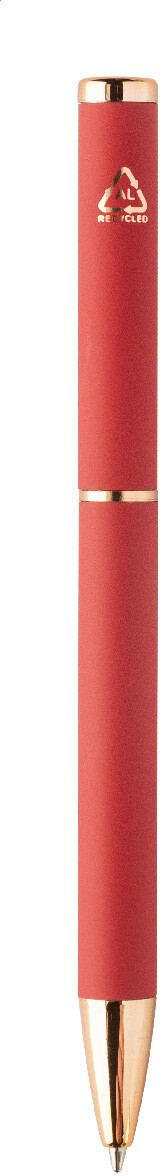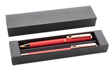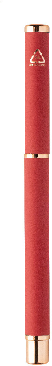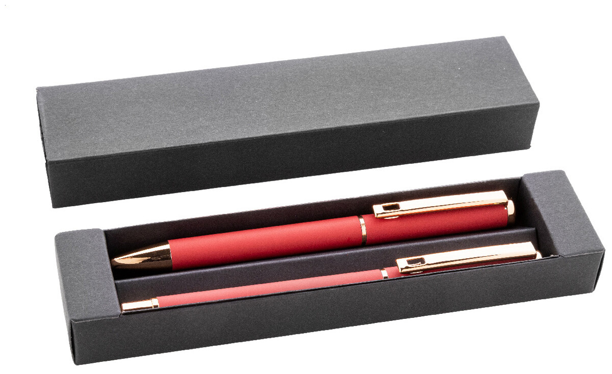 Sada per z recyklovaného hliníku s kuličkovým perem a rollerem s pogumovaným povrchem a detaily růžového zlata. S modrou náplní. Se speciálním povrchem pro zrcadlové laserové gravírování v růžovo-zlaté barvě. V černé papírové dárkové krabičce.