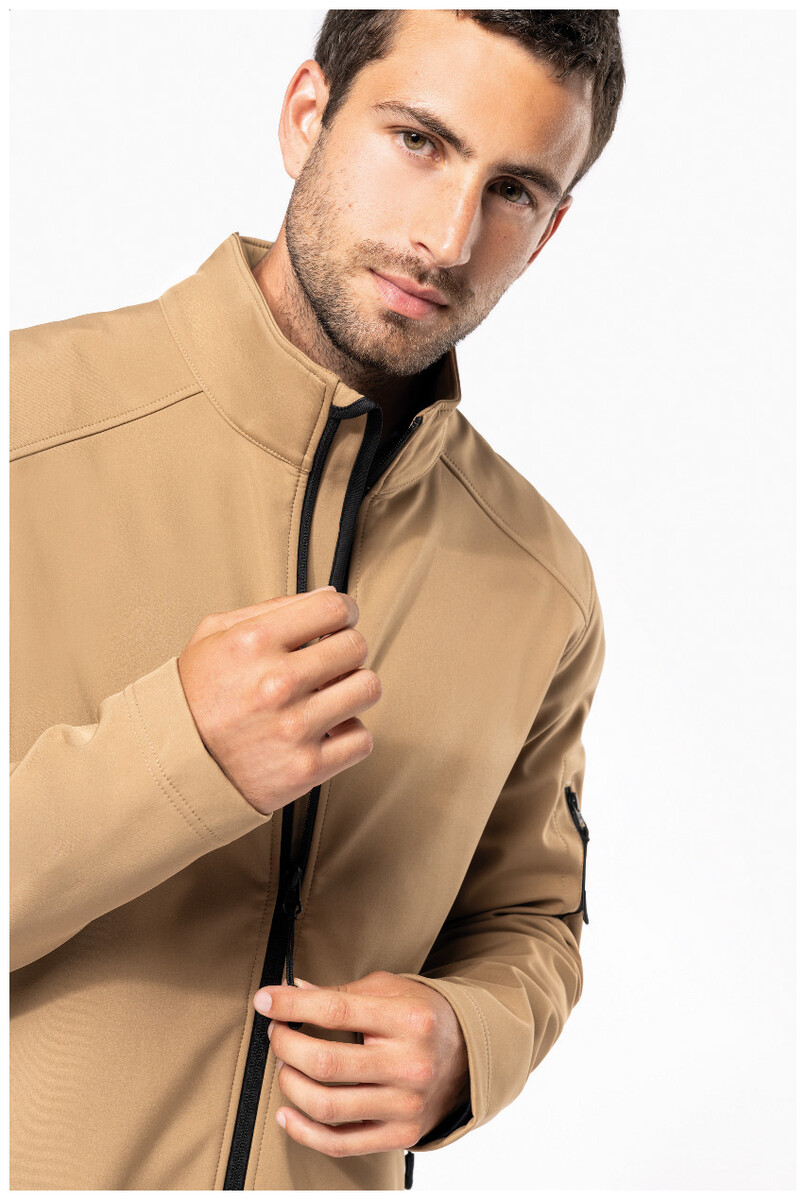 Třívrstvá, prodyšná, větru a vodě odolná softshellová bunda na zip s rukávy na zip a bočními kapsami. S prodyšnou střední vrstvou a vnitřní vrstvou z mikropolaru. Materiál: 95 % polyester a 5 % elastan, 300 g/m2. Výrobek značky Kariban.