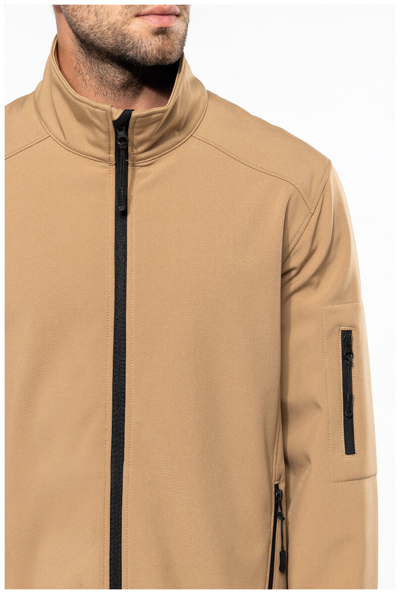 Třívrstvá, prodyšná, větru a vodě odolná softshellová bunda na zip s rukávy na zip a bočními kapsami. S prodyšnou střední vrstvou a vnitřní vrstvou z mikropolaru. Materiál: 95 % polyester a 5 % elastan, 300 g/m2. Výrobek značky Kariban.