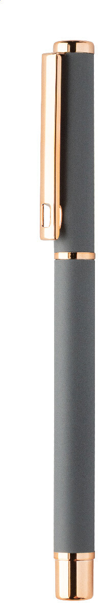 Sada per z recyklovaného hliníku s kuličkovým perem a rollerem s pogumovaným povrchem a detaily růžového zlata. S modrou náplní. Se speciálním povrchem pro zrcadlové laserové gravírování v růžovo-zlaté barvě. V černé papírové dárkové krabičce.