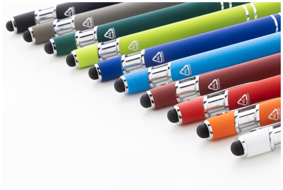 Kuličkové pero a pero pro dotykovou obrazovku z recyklovaného hliníku s pogumovaným tělem a chromovanými detaily. S modrou náplní.