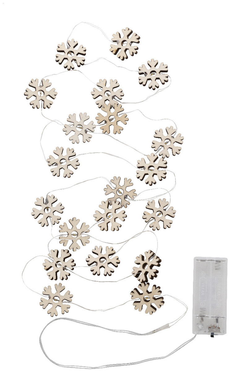 Vánoční světelná dekorace s 20 LED světly ve tvaru dřevěné sněhové vločky. Funguje na 2 AA baterie, bez baterií. S tlačítkem ZAP/VYP na pouzdře na baterie. V krabičce z kraftového papíru.
