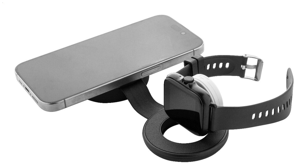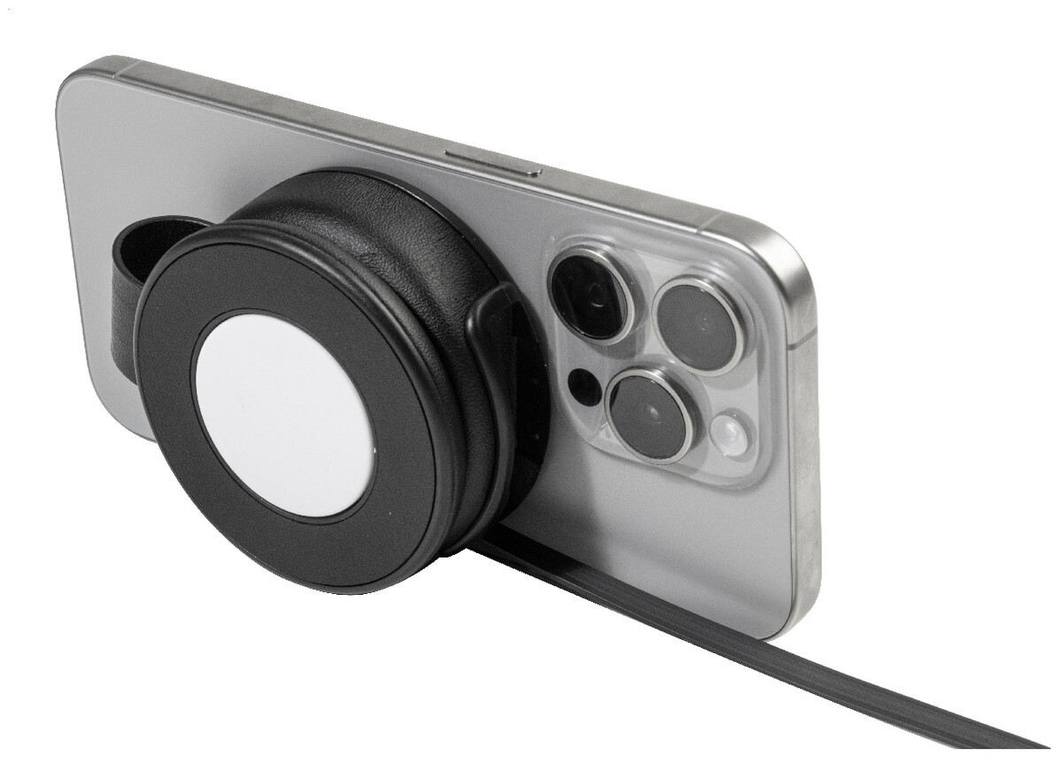 Luxusní skládací bezdrátová nabíjecí sada z recyklované PU kůže s magnetickou bezdrátovou rychlonabíječkou (15 W), sekundární bezdrátovou nabíječkou (2,5 W) pro chytré hodinky (Apple® a Samsung®) a vestavěným teleskopickým nabíjecím kabelem USB-C. Včetně samolepicího kovového kroužku pro použití magnetické funkce na jakémkoli bezdrátově nabíjecím zařízení. Kompatibilní s iPhone® 12 nebo novějším.