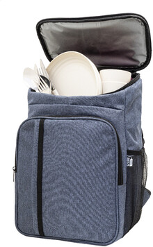 Chladicí piknikový batoh z RPET s přední kapsou na zip a chladicí přihrádkou na zip s PEVA výplní. S bočními síťovanými kapsami, polstrovanými zády a ramenními popruhy. Včetně nádobí z PP a nerezové oceli pro 2 osoby: 2 talíře, 2 hrnky, 2 vidličky, 2 lžíce a 2 nože. 600D RPET polyester s výrazným štítkem RPET.