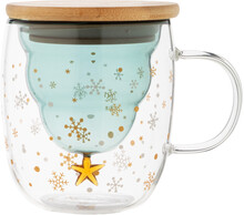 Dvoustěnný hrnek z borosilikátového skla s bambusovým víčkem, vzorem sněhových vloček a obráceným vánočním stromečkem uvnitř, 200 ml. V kraftové papírové krabičce.