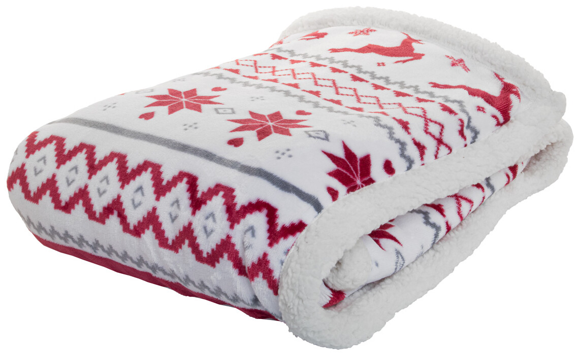 Dvouvrstvá vánoční deka ze 230 g/m2 flanelového fleecu RPET a oboustrannou podšívkou z RPET sherpa fleecu 210 g/m2. Zabalené do stuhy a potisknutelné papírové karty.