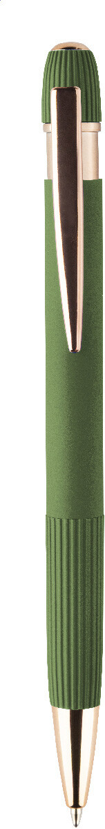 Kuličkové pero z recyklovaného hliníku s pogumovaným tělem a detaily v růžovo-zlaté barvě. Se speciálním povlakem pro zrcadlové laserové gravírování v růžovo-zlaté barvě. S modrou náplní.
