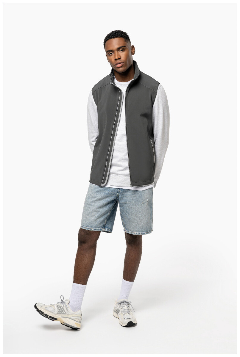 Dvouvrstvá softshellová vesta na zip s bočními kapsami na zip. S kontrastními zipy. Vodoodpudivá tkanina. Vnější strana: 95 % polyester a 5 % elastan. Vnitřní strana: 100% polyester micro polar fleece. 300 g/m2. Výrobek značky Kariban.