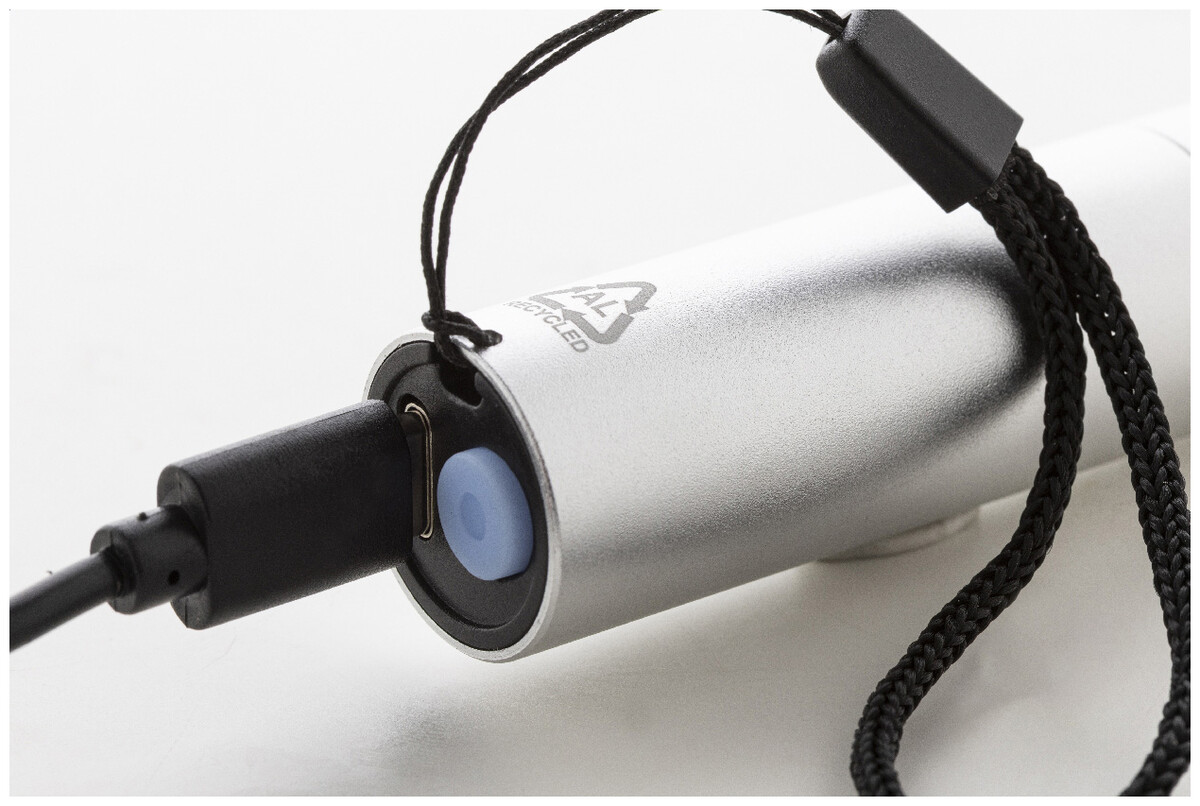 Baterka z recyklovaného hliníku s vestavěnou dobíjecí baterií USB (400 mAh) a popruhem na nošení. S vysoce výkonným COB světlem s možností zoomu a 3 světelnými režimy. Včetně nabíjecího kabelu USB.