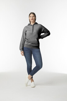 Mikina s kapucí, 80% bavlna a 20% polyester s přední kapsou. 285 g/m2 (bílá 278 g/m2). Značka Gildan.