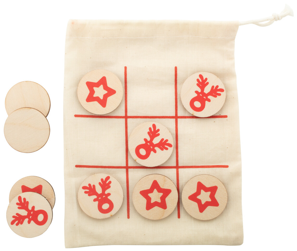 Vánoční designová hra piškvorky z březové překližky s 10 žetony a bavlněným pytlíkem.
