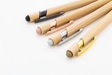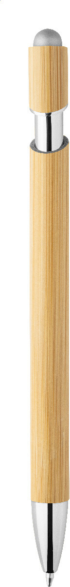 Bambusové dotykové kuličkové pero s lesklými kovovými detaily a barevným dotykovým stylusem. S modrou náplní.
