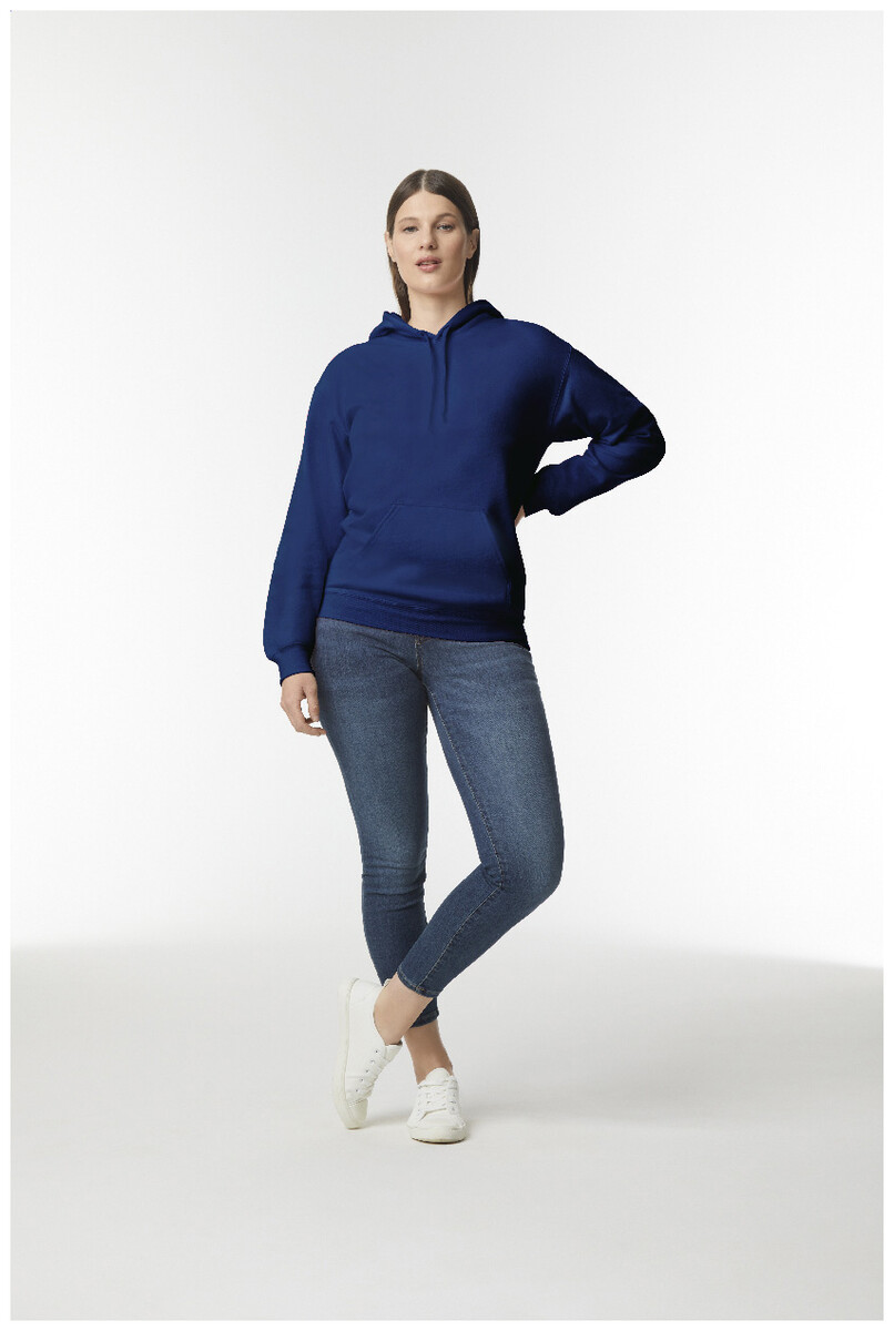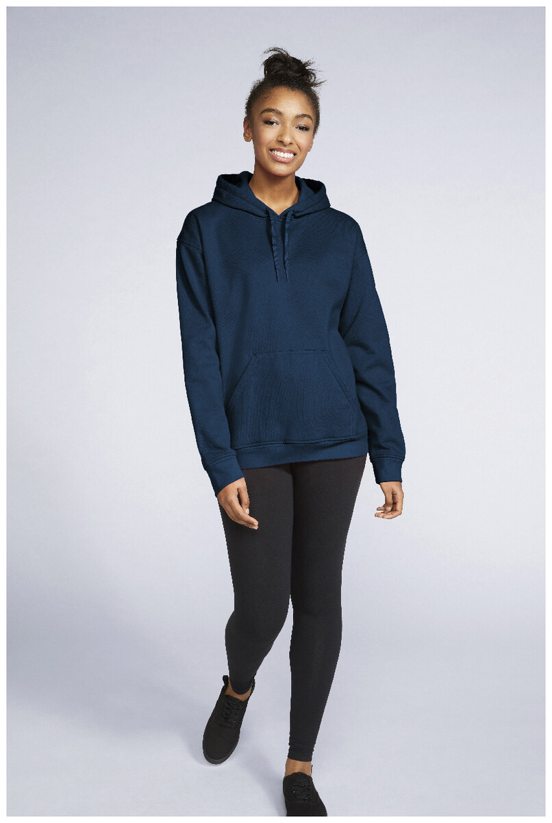Mikina s kapucí, 80% bavlna a 20% polyester s přední kapsou. 285 g/m2 (bílá 278 g/m2). Značka Gildan.