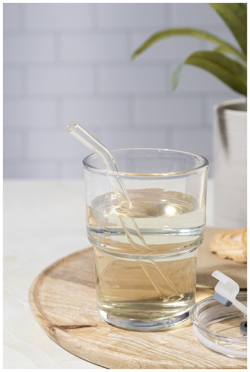 Skleněný cestovní hrnek s plastovým víčkem a skleněným brčkem. 400 ml.