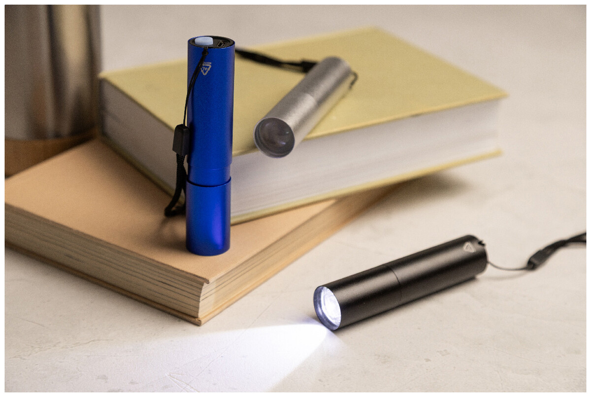 Baterka z recyklovaného hliníku s vestavěnou dobíjecí baterií USB (400 mAh) a popruhem na nošení. S vysoce výkonným COB světlem s možností zoomu a 3 světelnými režimy. Včetně nabíjecího kabelu USB.