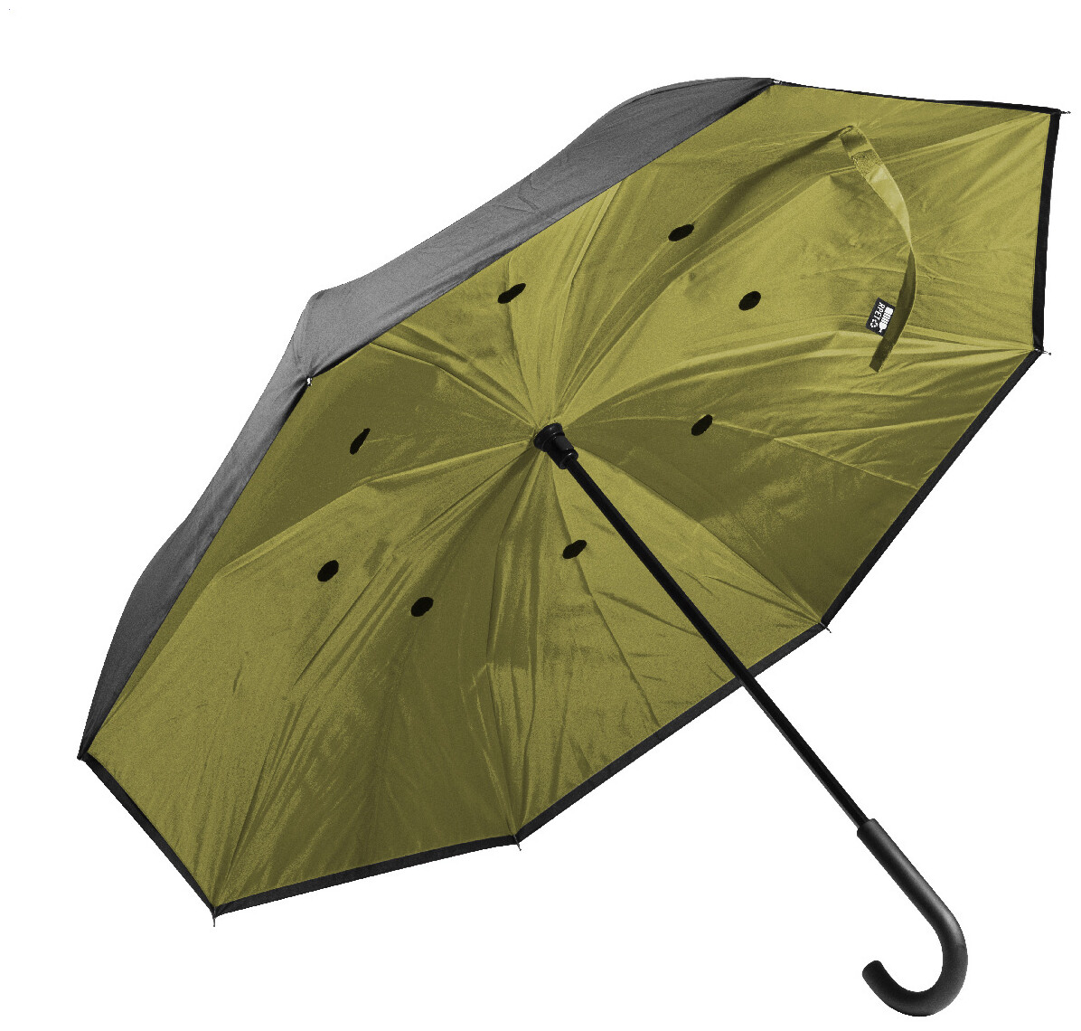 Manuální větruodolný deštník s reverzním otevíráním, 8 panely, dvouvrstvou dvoubarevnou stříškou, kovovým rámem, žebry ze skelných vláken a pogumovanou rukojetí. Materiál: 190T RPET pongee. S výrazným štítkem RPET.