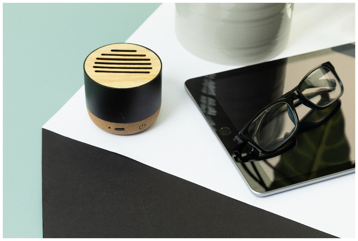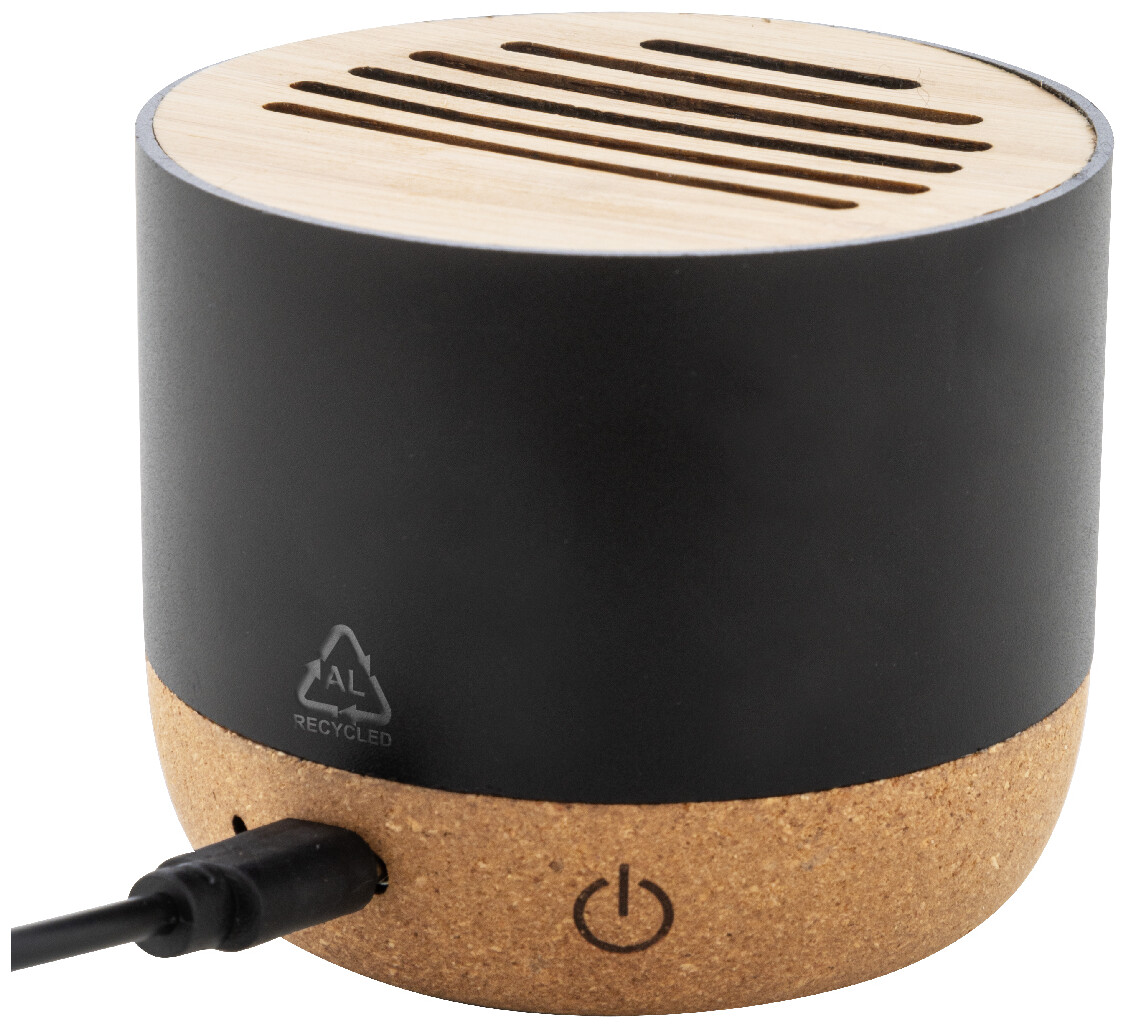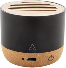 Bezdrátový reproduktor v pouzdře z recyklovaného hliníku s bambusovou síťovinou a základnou z přírodního korku. S dobíjecí baterií (400 mAh). Včetně nabíjecího kabelu USB.