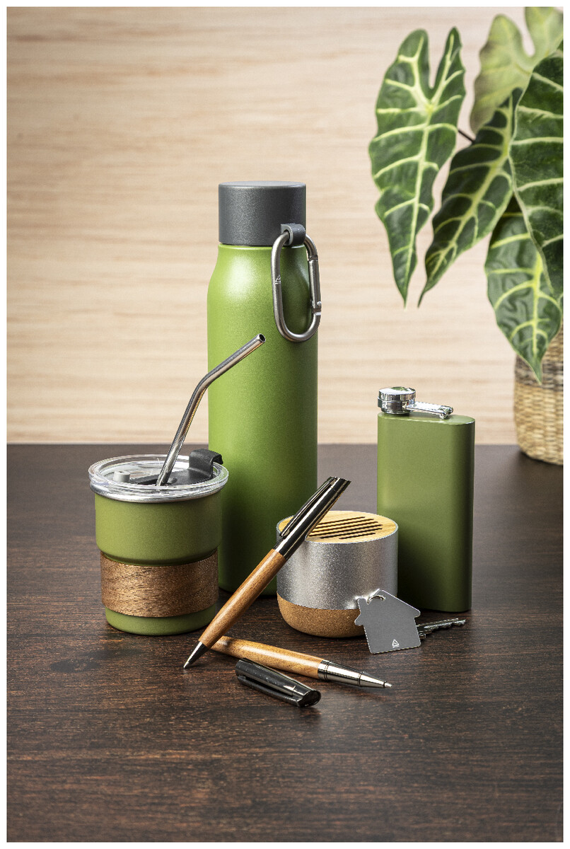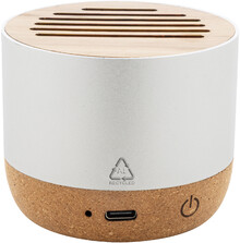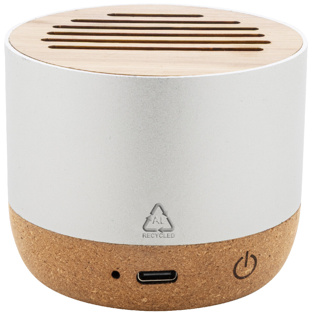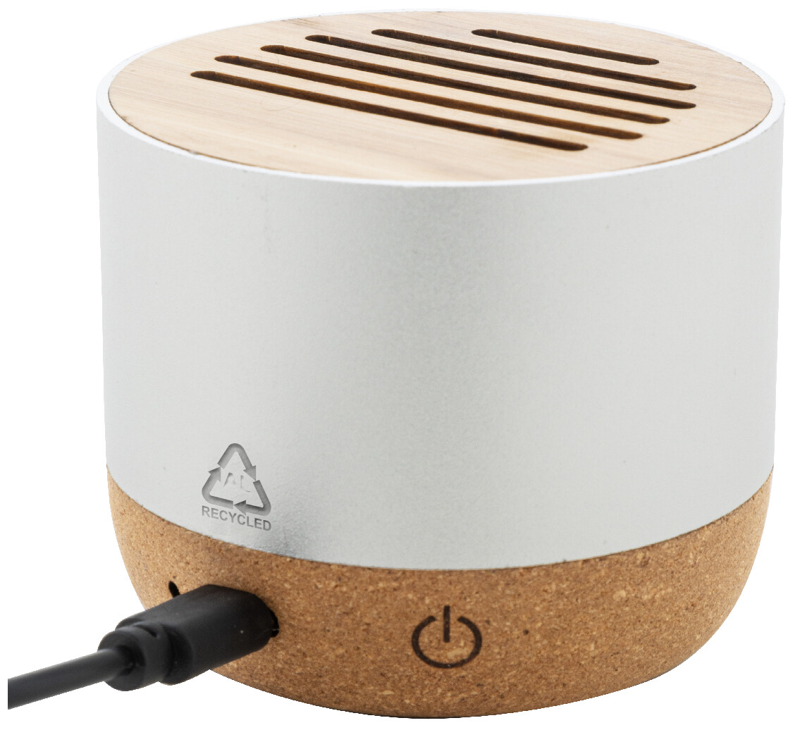Bezdrátový reproduktor v pouzdře z recyklovaného hliníku s bambusovou síťovinou a základnou z přírodního korku. S dobíjecí baterií (400 mAh). Včetně nabíjecího kabelu USB.