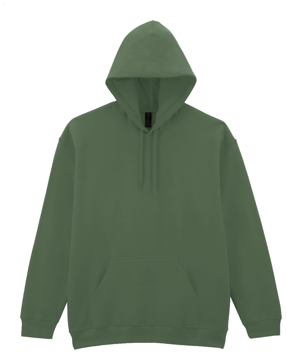 Mikina s kapucí, 80% bavlna a 20% polyester s přední kapsou. 285 g/m2 (bílá 278 g/m2). Značka Gildan.