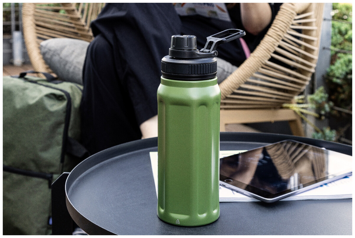 Dvoustěnná termoska z recyklované nerezové oceli s vertikálními drážkami. S víčkem z polypropylenu a s integrovaným držadlem. 540 ml.