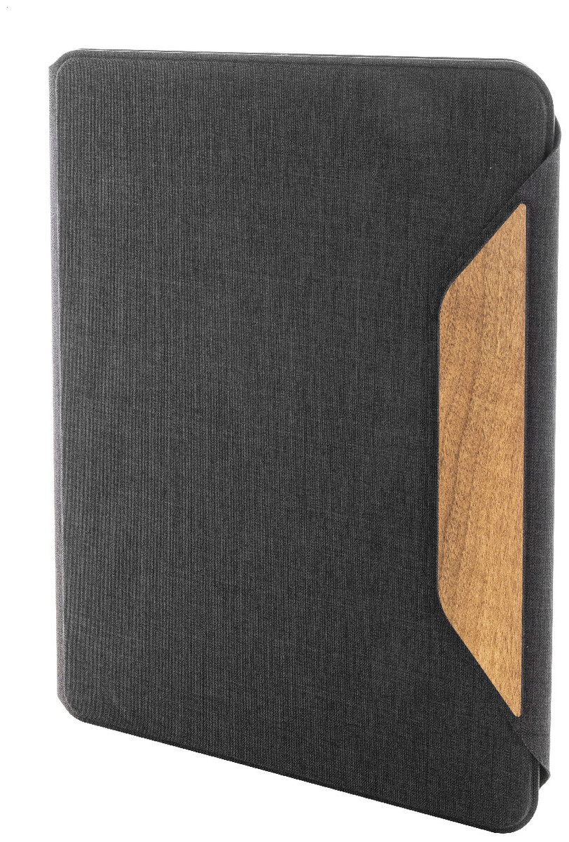 Složka na dokumenty A4 z RPET polyesteru s několika vnitřními kapsami a magnetickým zapínáním s detaily z ořechového dřeva. S linkovaným blokem z recyklovaného papíru s 20 listy.