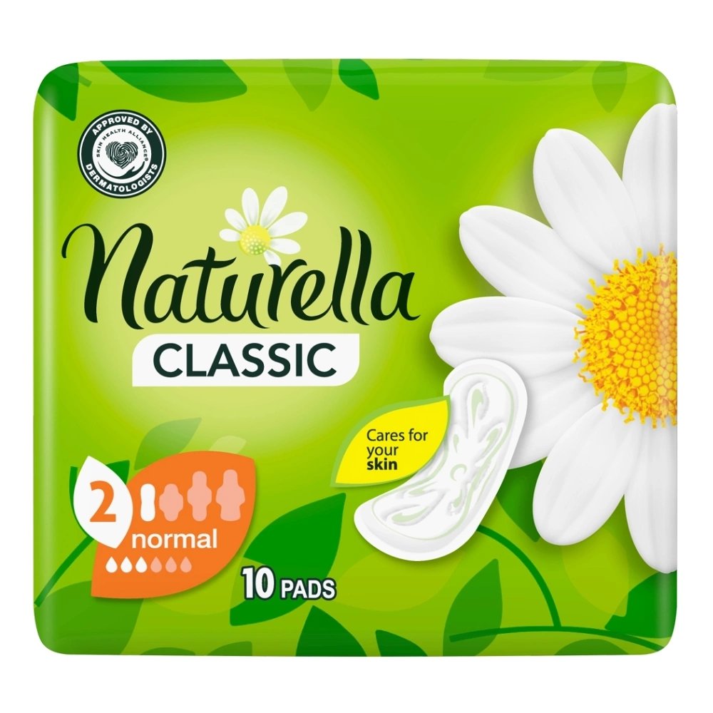Dámské vložky Naturella Chamomile Classic Normal s křidélky zajišťují ideální ochranu a péči o pokožku během menstruace, doplněné přírodní heřmánkovou vůní.
