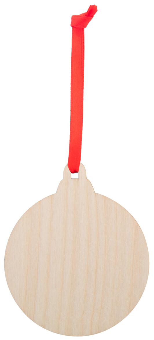Vánoční ozdoba z březové překližky, s tištěným vánočním designem a červenou stužkou, která je dodávána zvlášť.