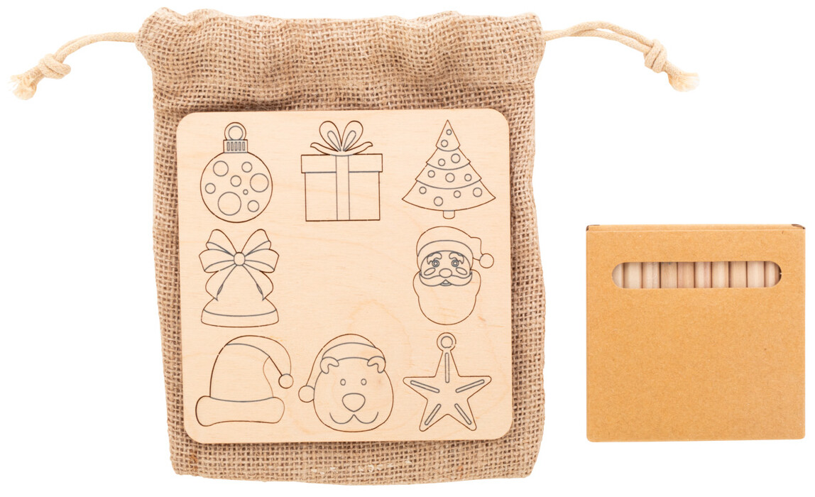 Vánoční vybarvovací hra z březové překližky s jutovým pouzdrem. Obsahuje tématické vyřezávané figurky (8 ks) a dřevěné barevné tužky (12 ks) v papírové krabičce.