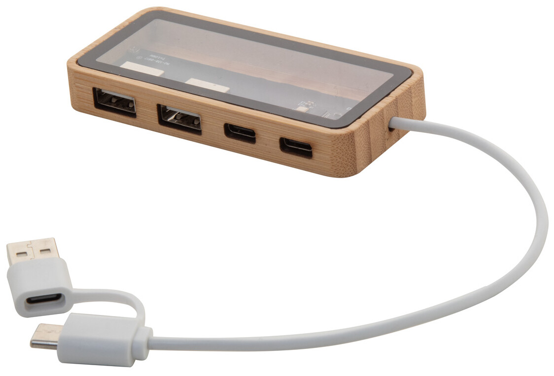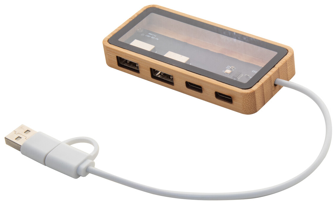 Poloprůhledný bambusový USB hub s viditelnými elektronickými součástkami, 2 USB a 2 USB-C porty, USB 2.0. Včetně kabelu s připojením USB a USB-C.