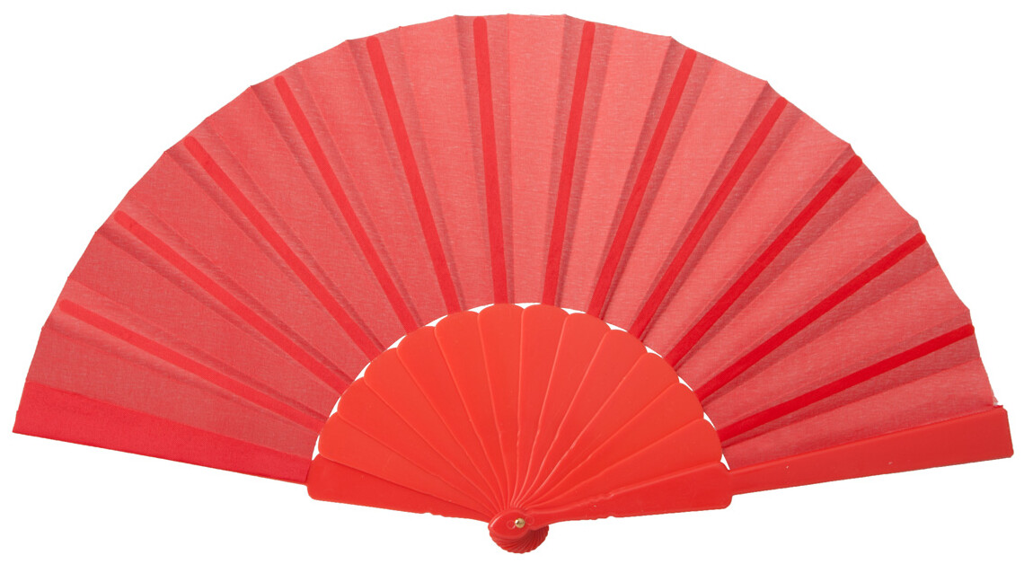Látkový vějíř s plastovou rukojetí.